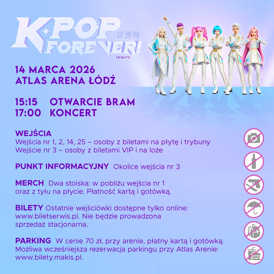 Prezentujemy zbiór istotnych informacji praktyczno-organizacyjnych związanych z koncertem K-POP FOREVER!, który odbędzie się 14 marca 2026 roku w Atlas Arenie w Łodzi.
